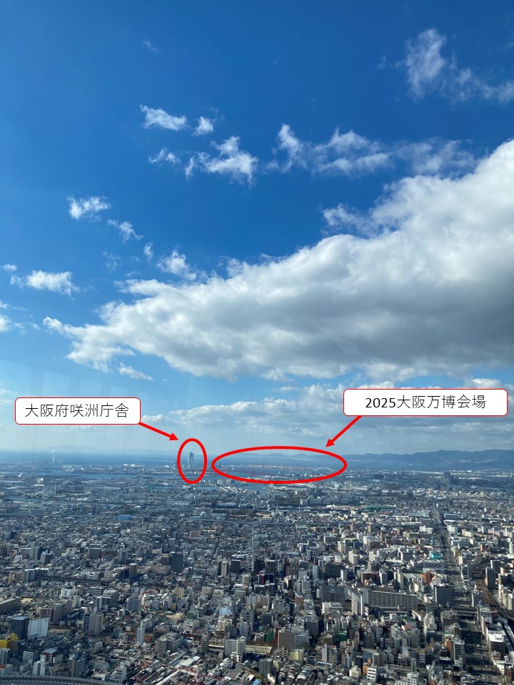西側には、南港にある大阪府の咲洲庁舎、そして、その横には現在建設途中の大阪・関西万博の会場もくっきりと見えました!