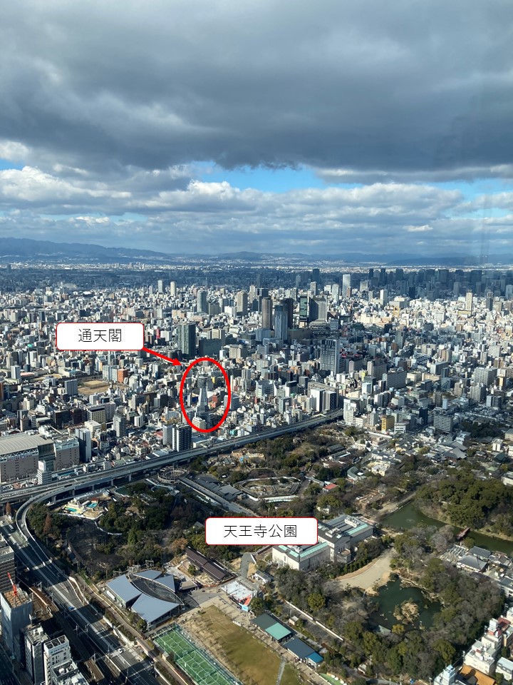 北側には天王寺動物園がある天王寺公園や、大阪のシンボルタワーである通天閣が見え、
